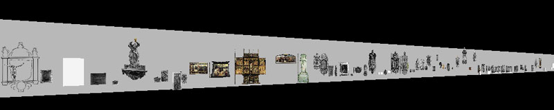 Hier ist mal ein Ausschnitt einer 200 Meter langen Wand, auf denen die Konturen der Kunstwerke aus einem 3D-Modell gezeigt sind. Man beachte, die Epitaphien von Heideck, Lange, Olearius, Hommel und Ryssel haben Höhen von über vier Meter.