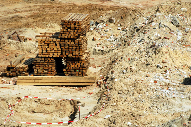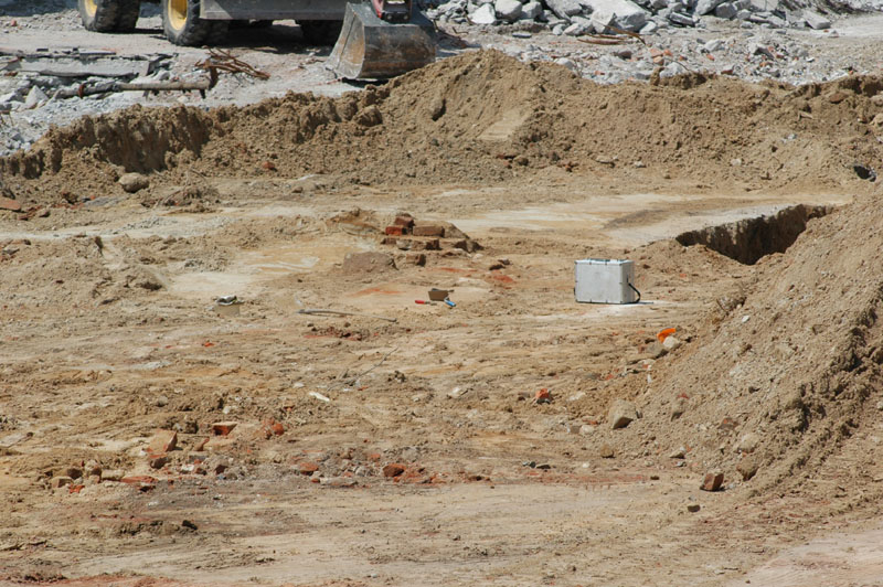Grund ist ganz einfach der, daß bereits am darauffolgenden Tag der vorhin gezeigten Aufnahmen, also gestern, man Mauerteile entfernt hat und der Boden planiert wurde, um Bodendenkmalreste zu beseitigen bzw. Spuren zu verwischen.